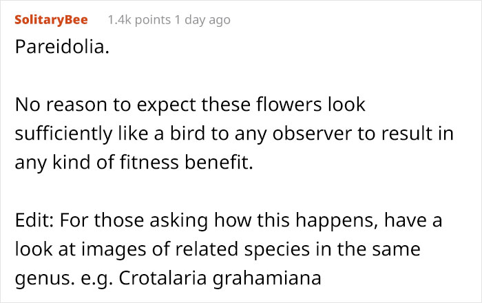 一位名叫SolitaryBee的網友跳出來解答,他表示這這很明顯只是人類的錯覺而已,首先最大的原因就是:看起來像鳥兒對植物來說完全沒有好處!有些動物如竹節蟲、枯葉蛾的外觀看起來很像枯枝落葉,如此一來可以保護自己不被天敵發現;但是開花植物必須依靠動物為它授粉,而鳥類正好是蝴蝶、蜜蜂們的剋星,所以植物根本沒必要把花朵生的像鳥兒!