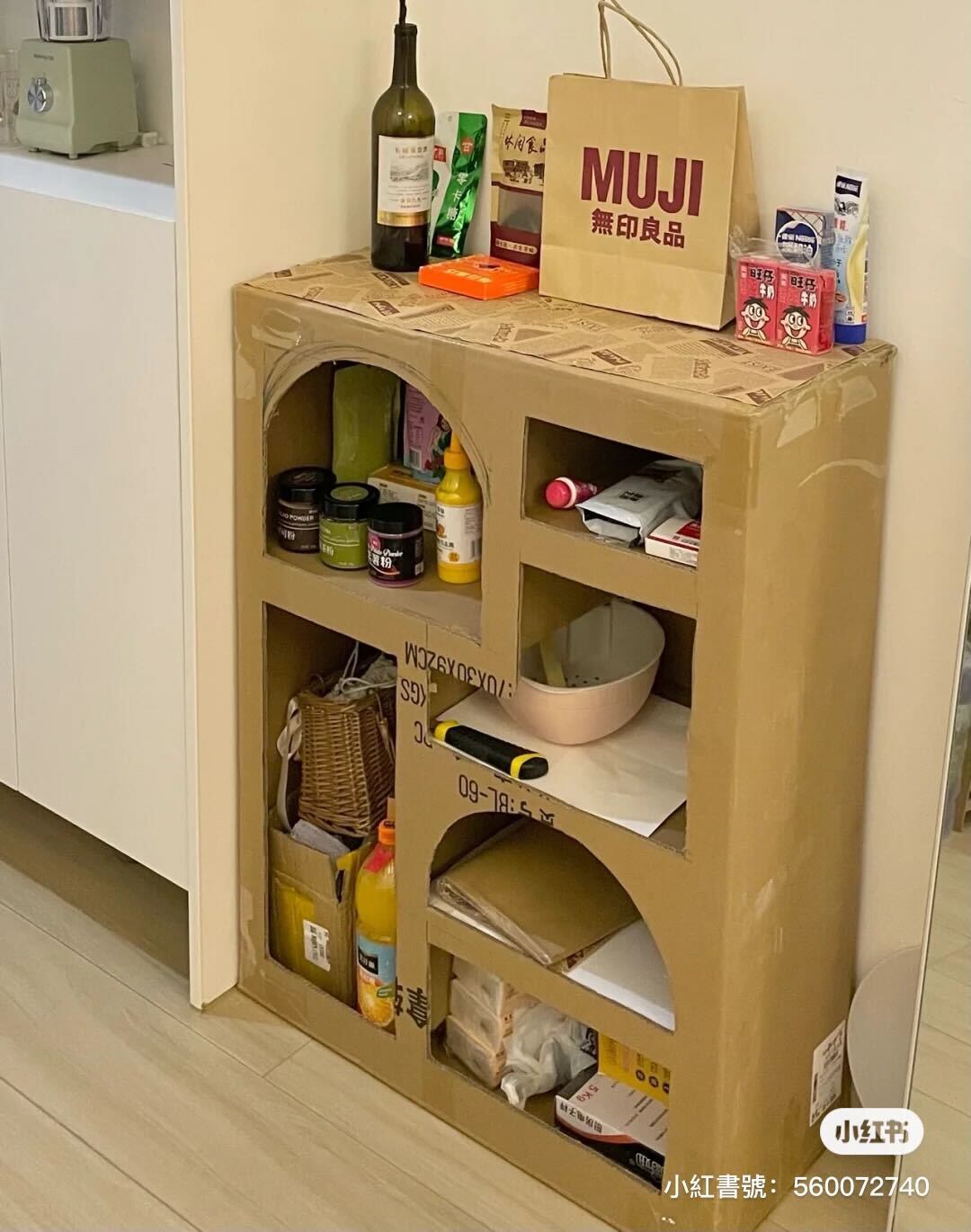 最棒的是最後作者就把它放在家裡的某個小角落,各個平面大多都放一些小的、輕的物品,例如小飲品、果醬等,木頭色的樣子跟牆面相當融合呢~作者還很自豪地說「看我0元用紙箱改造置物櫃」。