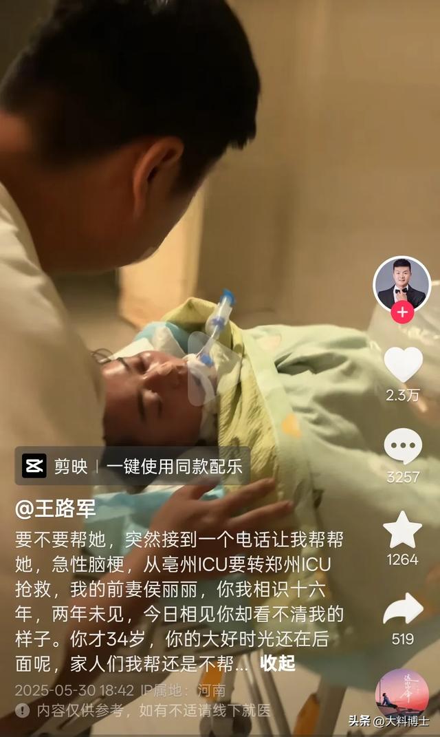 她的前夫是河南網紅「王路軍」,王路軍在抖音擁有200多萬粉絲,接到前妻家人求助後,他還發了一支去醫院看望侯麗麗的影片,並說道:「突然接到一個電話讓我幫幫她,急性腦梗,從亳州ICU要轉鄭州ICU搶救,我的前妻侯麗麗,你我相識十六年,兩年未見,今日相見你卻看不清我的樣子。你才34歲,大好時光還在後面呢,家人們我幫還是不幫...」