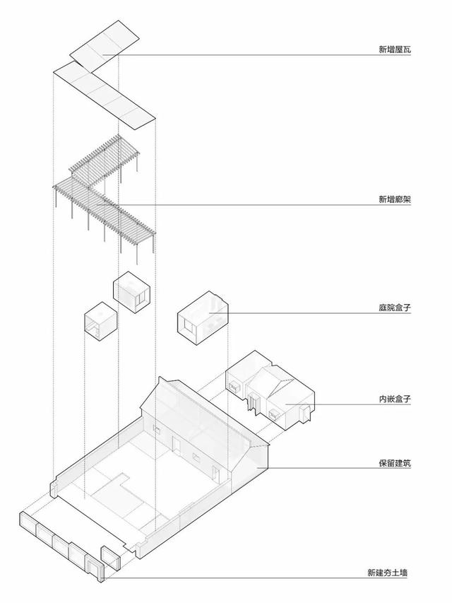 為了更加完整地保留青瓦屋頂和南側的土牆,設計師用了「偷梁換柱」的形式,在承重牆的後上方,加入了支撐屋架,從而拆除後牆。